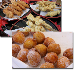愛南町グルメが目白押し!★愛南カワハギ千尋丸 魚のかわいいイラストと「千尋丸」と書かれた看板が目印のブース。愛南カワハギ千尋丸です。店主自ら獲ってきたカワハギをカラッと揚げています。プリプリの身が特徴の商品です。なかなか味わうことの出来ない逸品ですので、この機会にぜひ、ご賞味ください。 ★ごろく屋 オレンジの提灯が目印のブース。甘いかぼちゃを使った生地で作ったドーナツは幅広い年代に人気の商品。この機会にぜひお召し上がりください。 |