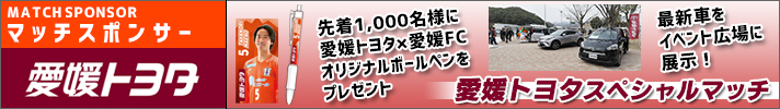 愛媛トヨタ自動車プレゼンツ!お楽しみ抽選会! マッチスポンサー愛媛トヨタ自動車プレゼンツ! 愛媛FC 2019シーズンのオーセンティックユニフォームが8名様に当たる抽選会を開催します! 【場所】スタジアム内 【時間】ハーフタイム |
